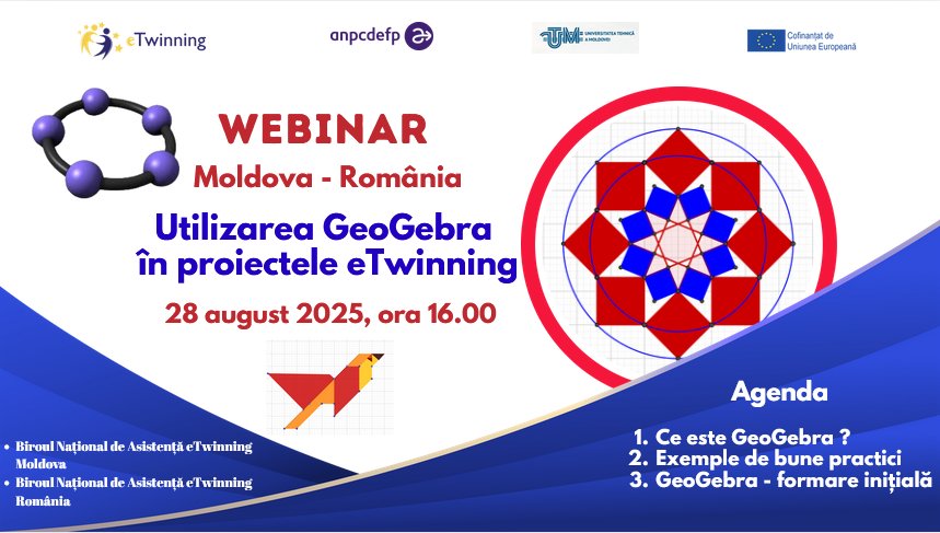 Eveniment eTwinning Utilizarea GeoGebra în proiectele eTwinning 28 august 2025 Ora 16:00 Online pe Google Meet Formatori: Mihaela Git – Ambasador eTwinning Ludmila Cojocari – […]